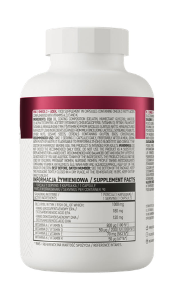 Performance - un emballage du produit suffit pour 3 mois de supplémention régulière.OstroVit Oméga 3 + ADEK - source complète d'ingrédients actifsAcides gras polyinsaturés oméga 3 sont des composés appartenant au groupe des acides gras essentiels (AGE). L'organisme n'étant pas capable de les synthétiser lui-même, les acides gras oméga-3 doivent lui être apportés de l'extérieur, par l'alimentation ou des compléments alimentaires.