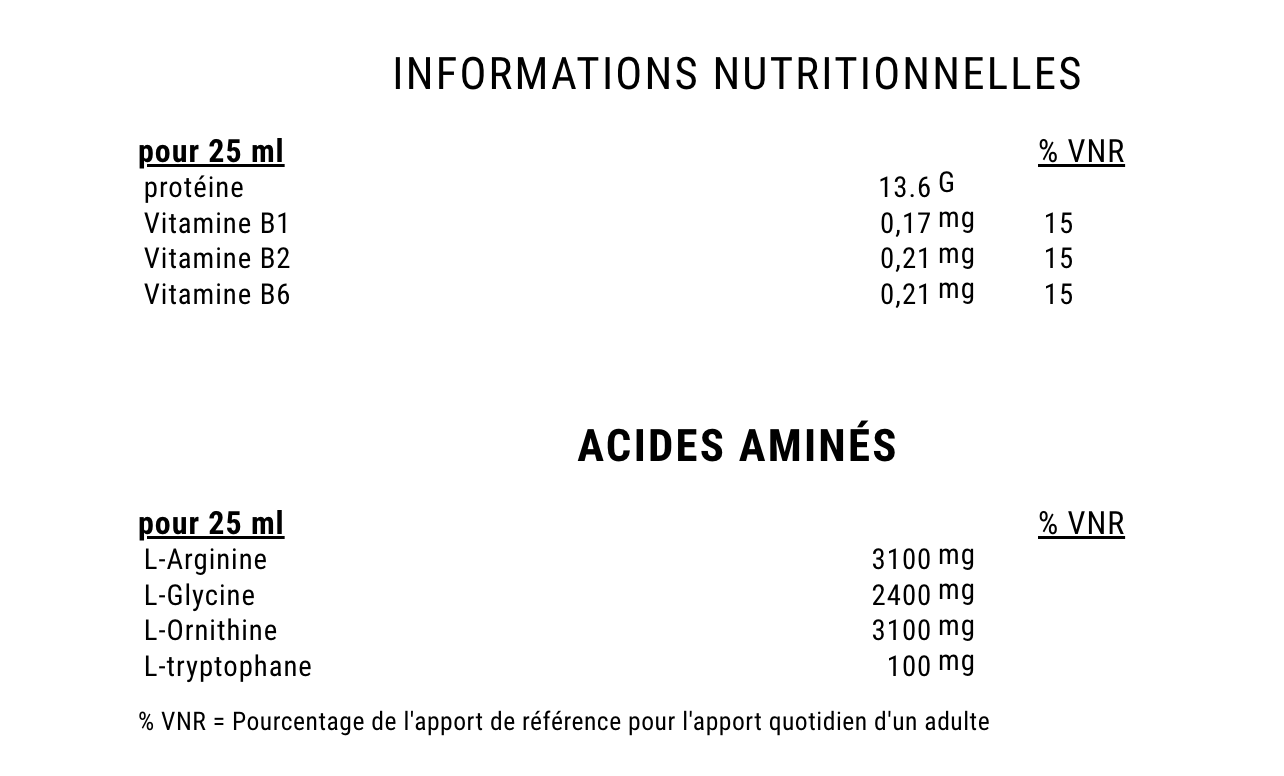 - 3,1 g chacun de L-arginine et de L-ornithine par ampoule